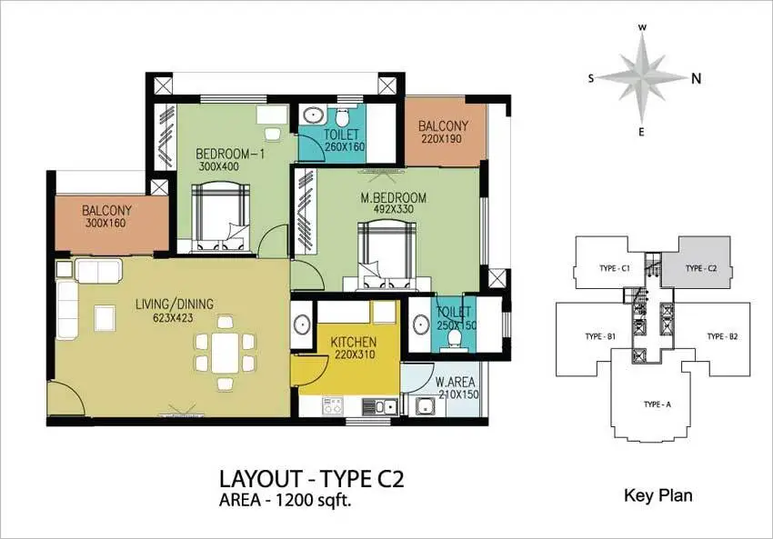 Living/Dining/lobby – Premium quality imported vitrified slabs 1m x 1m. Bedrooms – Premium quality vitrified tiles 60cm x 60cm. Kitchen – Grade five ceramic tiles. Toilet – Anti skid ceramic tiles.