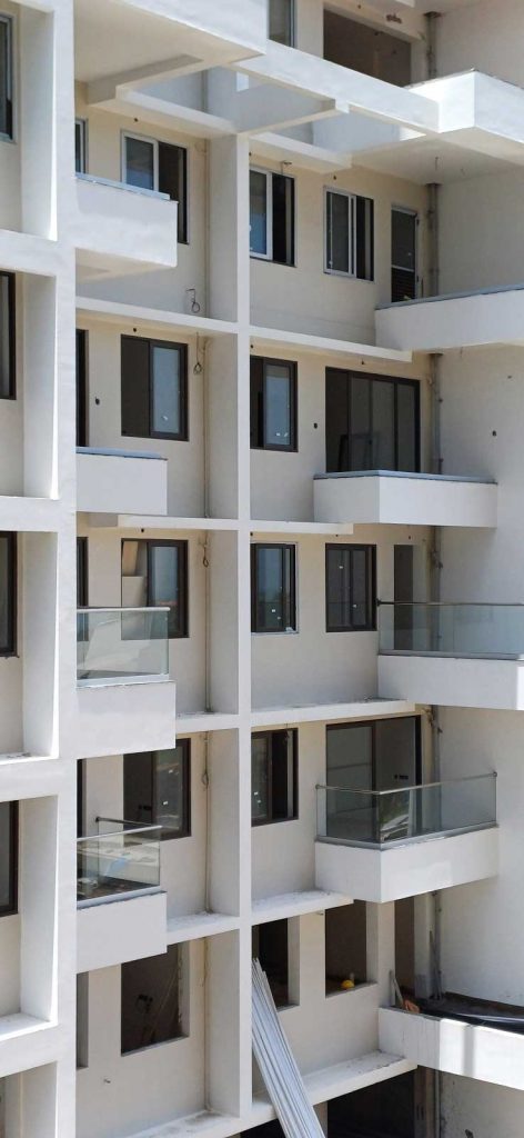 - External Finishes Sliding Doors and Windows – 7A,4B,1D,1A,1C,1B,3B,2A,2D,2B,9B completed BALCONY HANDRAILS -3B,7B,7A,1A,1B,1D 7D,16D,9B,2B,3A,3D,6A,5A,15B completed.PLASTERING: A & D front area external plastering completed, Service lift rear side external plastering completed, A flat rear side m bed external plastering completed, D Flat rear side plastering completed, B flat front portion, C flat front portion, M bed side, fire stair side completed, B & C rear side completed, External Painting – first coat 98% completed (putty and primer)