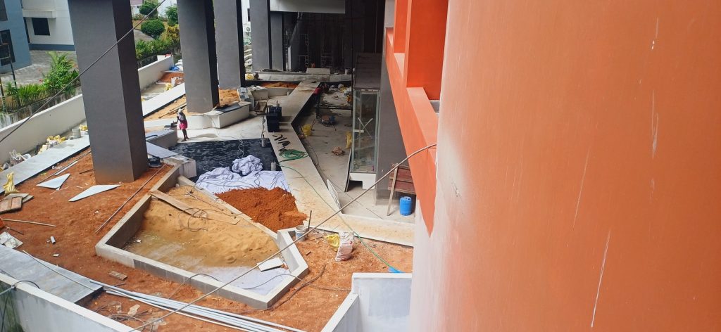- Civil Works – Ceiling and wall plastering 85% completed,MASONRY WORKS, Block/ brick- Basement 1 floor 100% completed, Basement 2 floor – 100% completed,Ground floor – completed, Party area toilet block work – 100% completed Swmimming pool area toilet & pump room block work 100% completed,Block work for seater in GF landscape area – 100% completed ,GF duct brick work – completed, Inside plastering – Basement 2 inside wall plastering completed,Water tank plastering completed,Party area toilet plastering 100% completed, Swimming pool area toilet plastering – 100% completed 16th Terrace protection plastering 100% completed,Protection plastering GF yard area- 100% Protection plastering Holding tank- 100%,compound wall plastering-25%